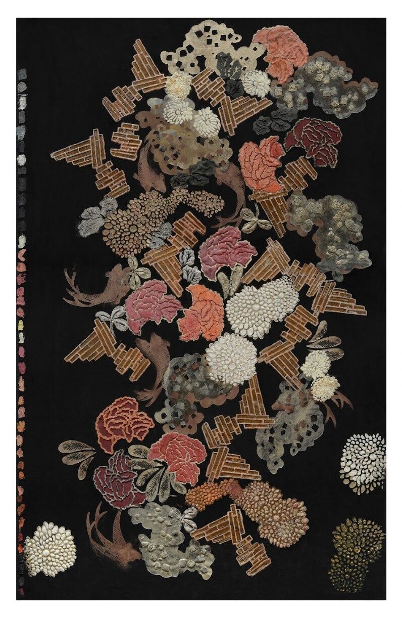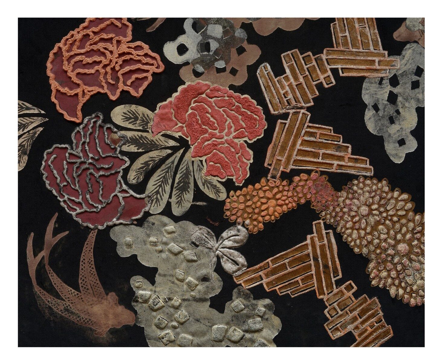 The elements of an embroidered obi made with silk threads fragment when converted into individual patterns. I redraw the patterns because, as always in my handcrafted work, there is a vital need to do it by hand. And thus, they begin to break free from their rigidity.