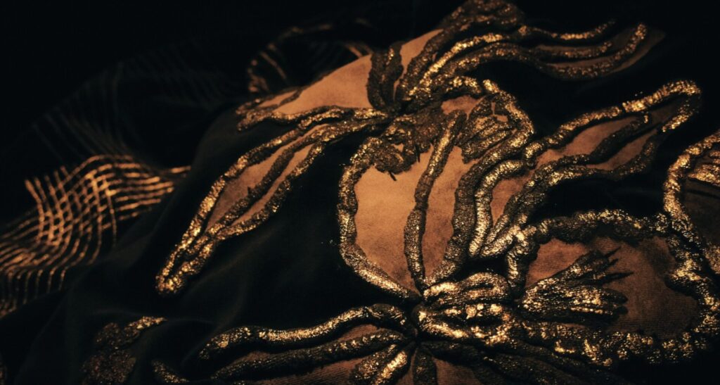 En este entorno, se revela un ecosistema de terciopelo, donde tapados, kimonos e islas flotantes entre luces y sombras. Los haces de luz atraviesan el espacio, creando formas efímeras, mientras cortinas de finas cadenas plateadas interrumpen ocasionalmente la quietud de este hábitat.