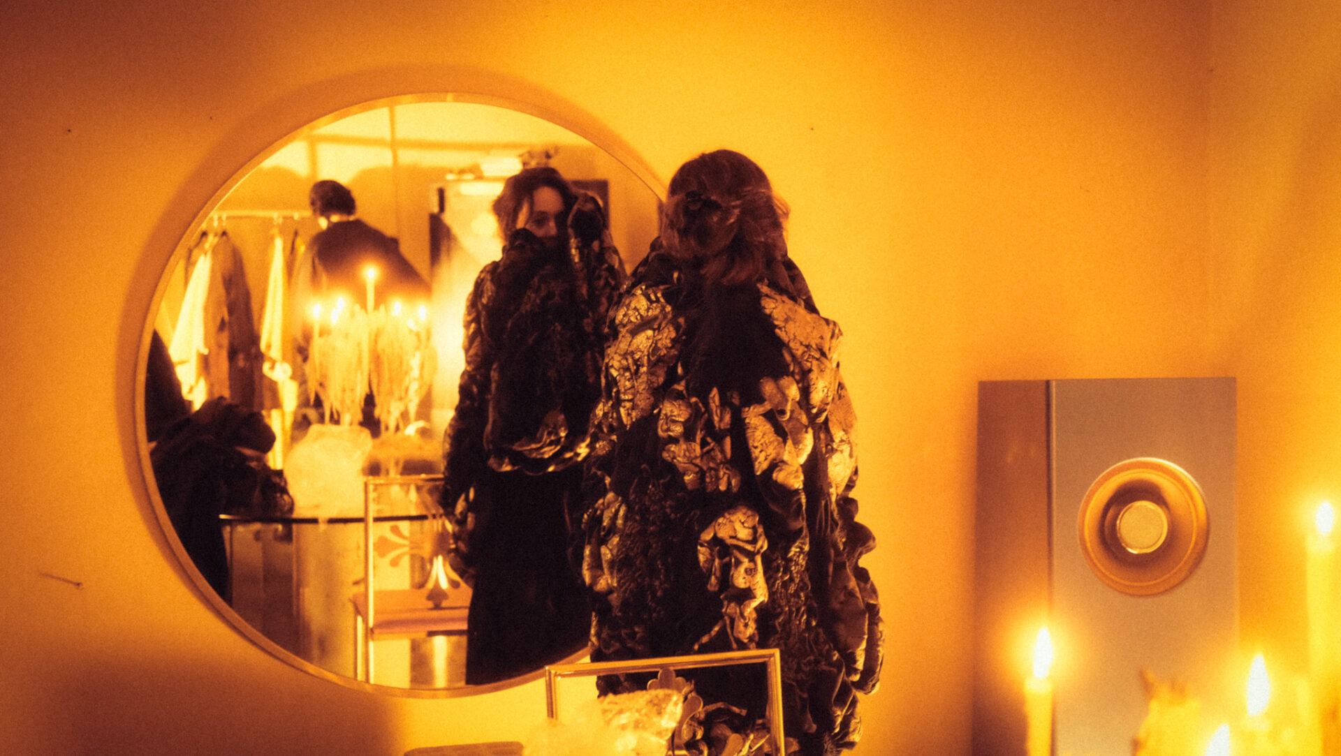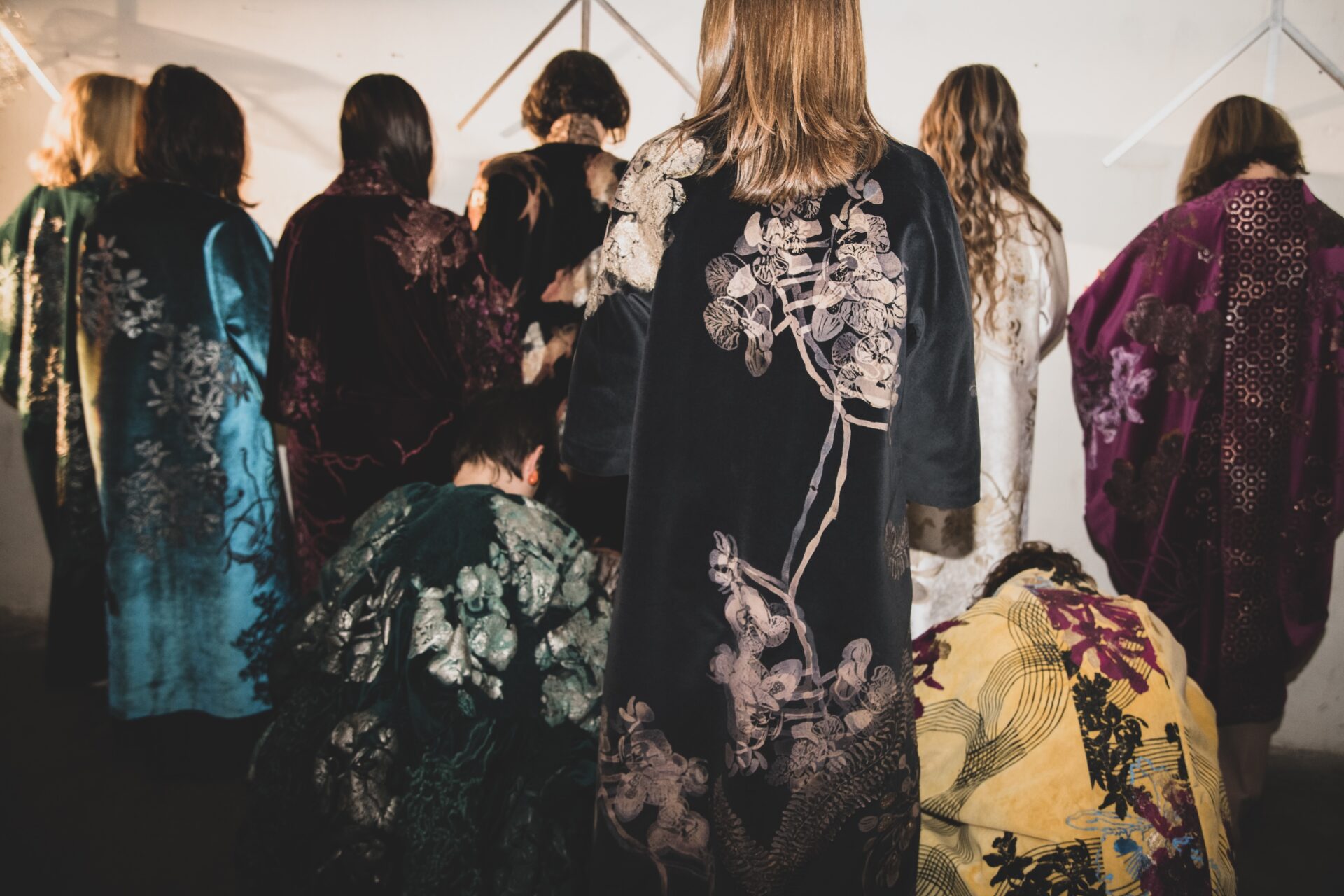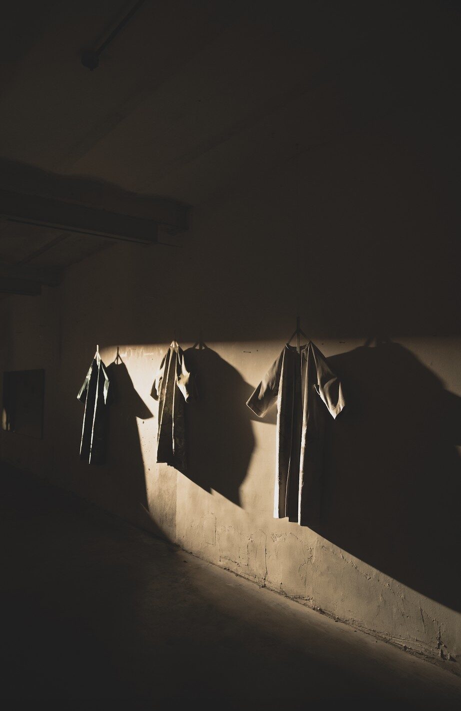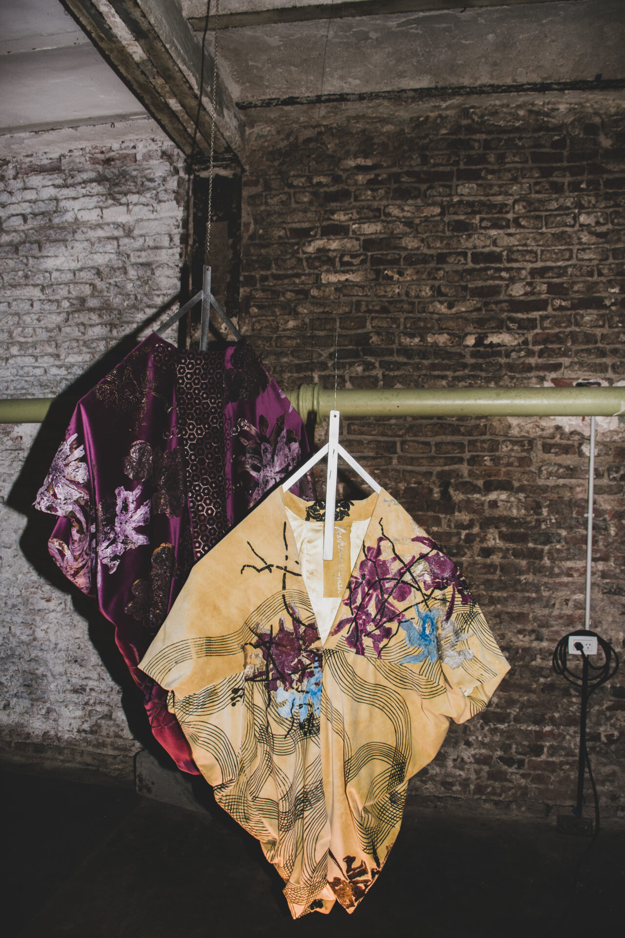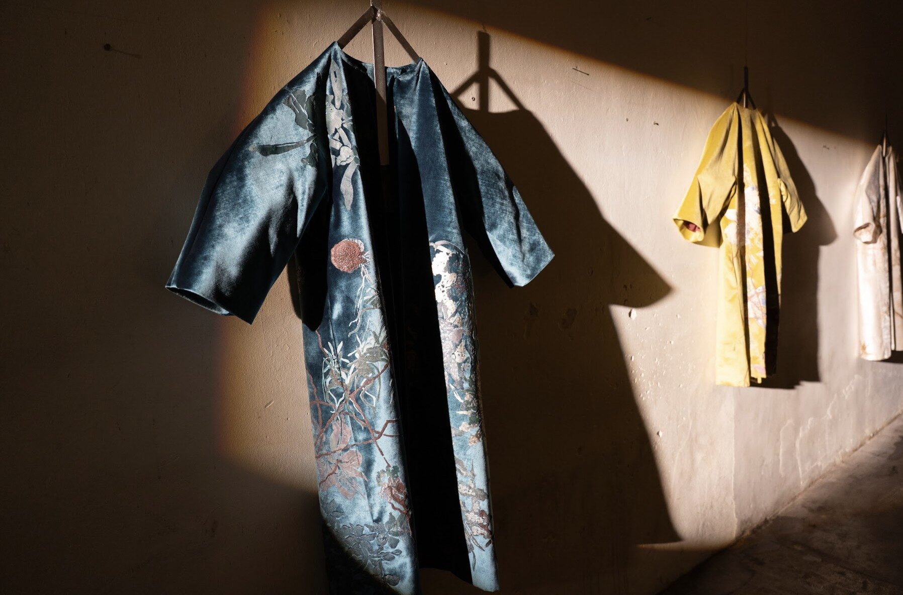 Y como si el proceso necesitara completarse en secreto, apenas a unos pasos, detrás de una cortina de terciopelo, espera un perchero habitado por los tapados. Silenciosos, suspendidos, son la evidencia final de ese recorrido: cuerpos textiles que, como frutos de un rito, encarnan todo lo que antes fue apenas boceto, experimento o intuición.