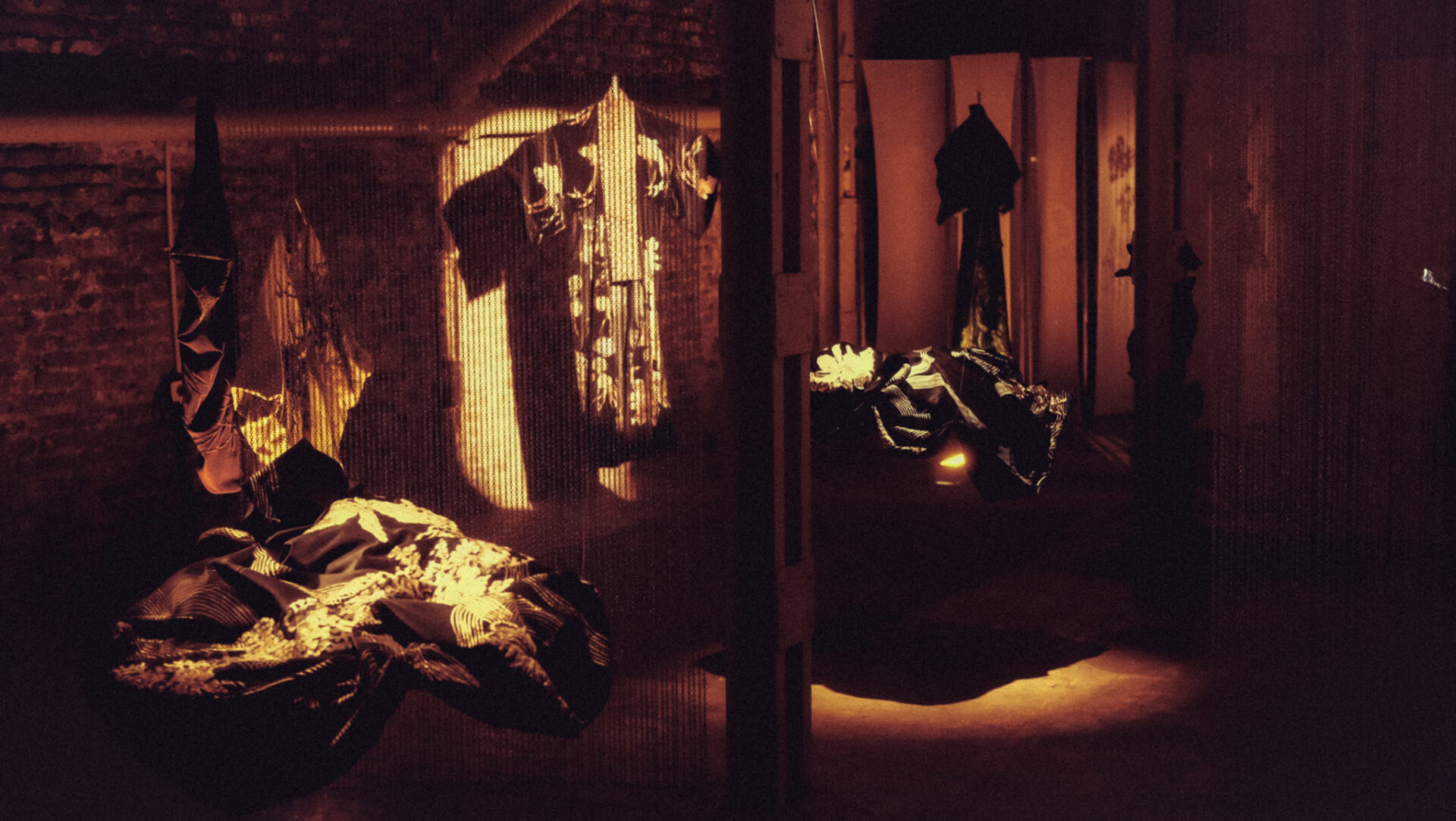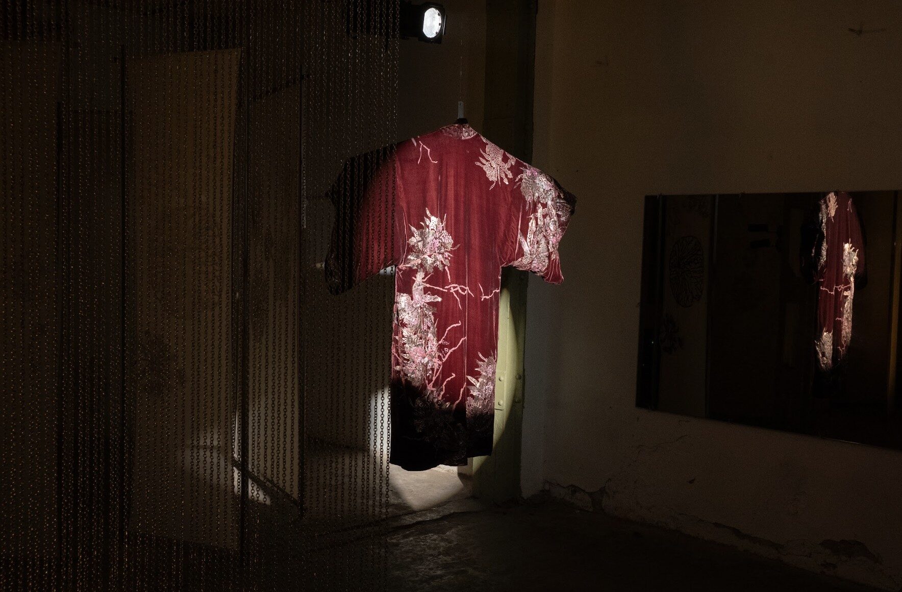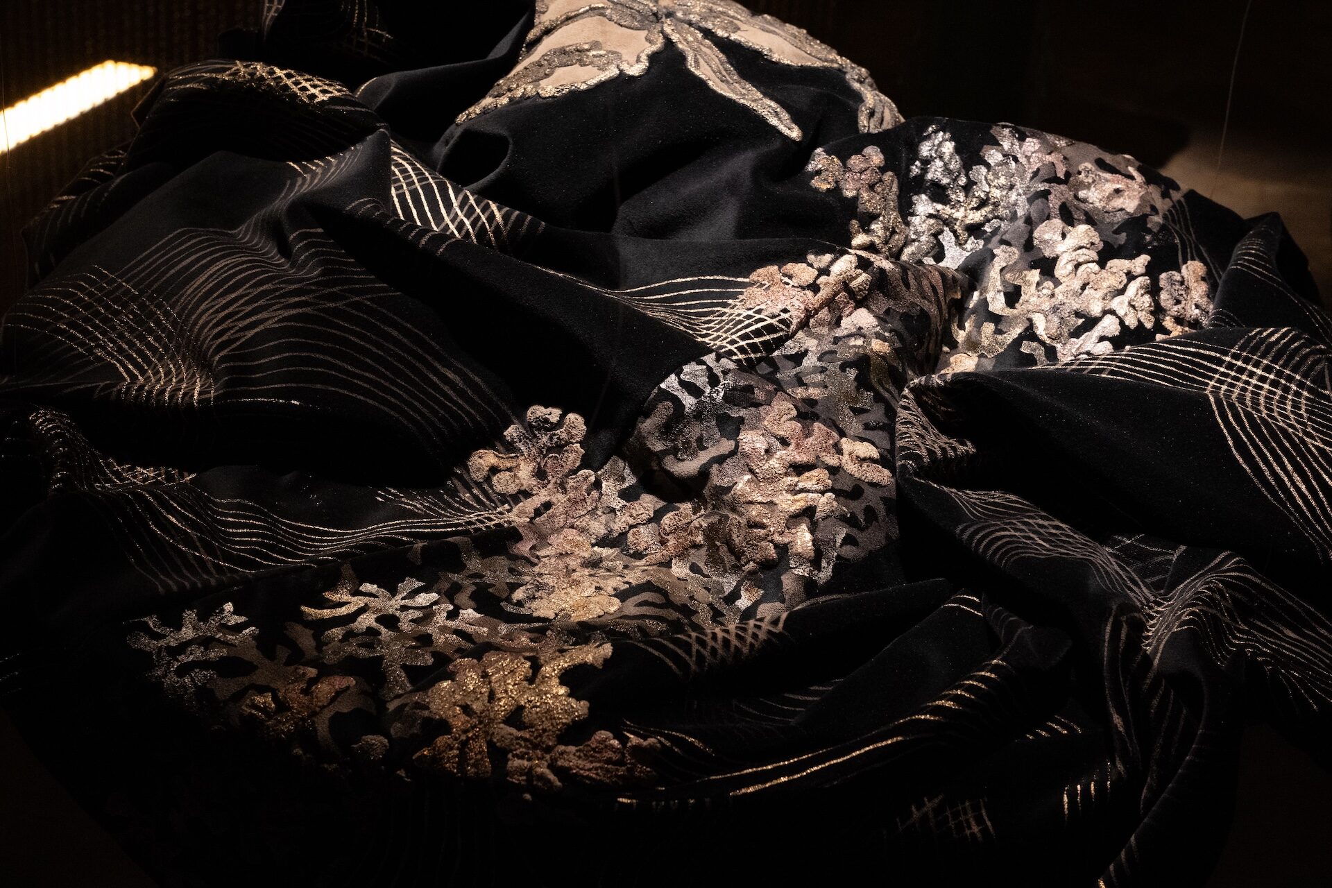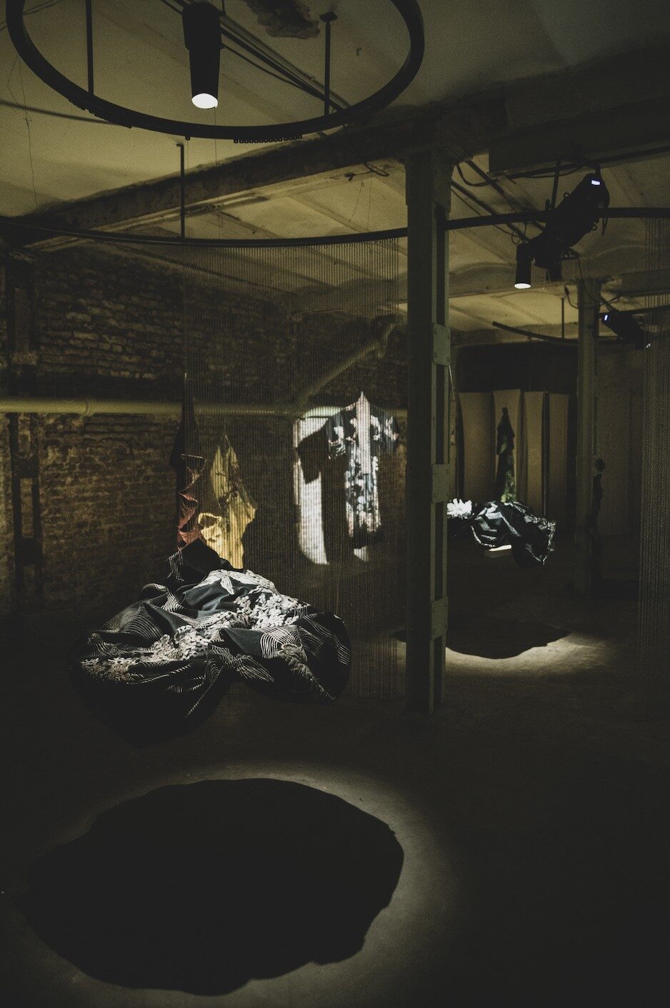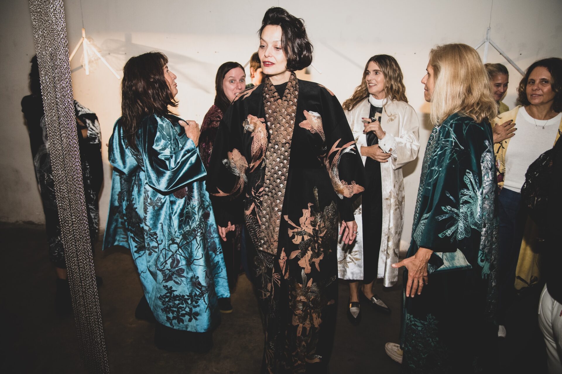 En este entorno, se revela un ecosistema de terciopelo, donde tapados, kimonos e islas flotantes entre luces y sombras. Los haces de luz atraviesan el espacio, creando formas efímeras, mientras cortinas de finas cadenas plateadas interrumpen ocasionalmente la quietud de este hábitat.