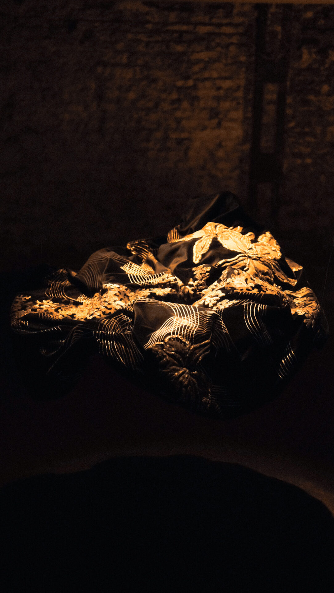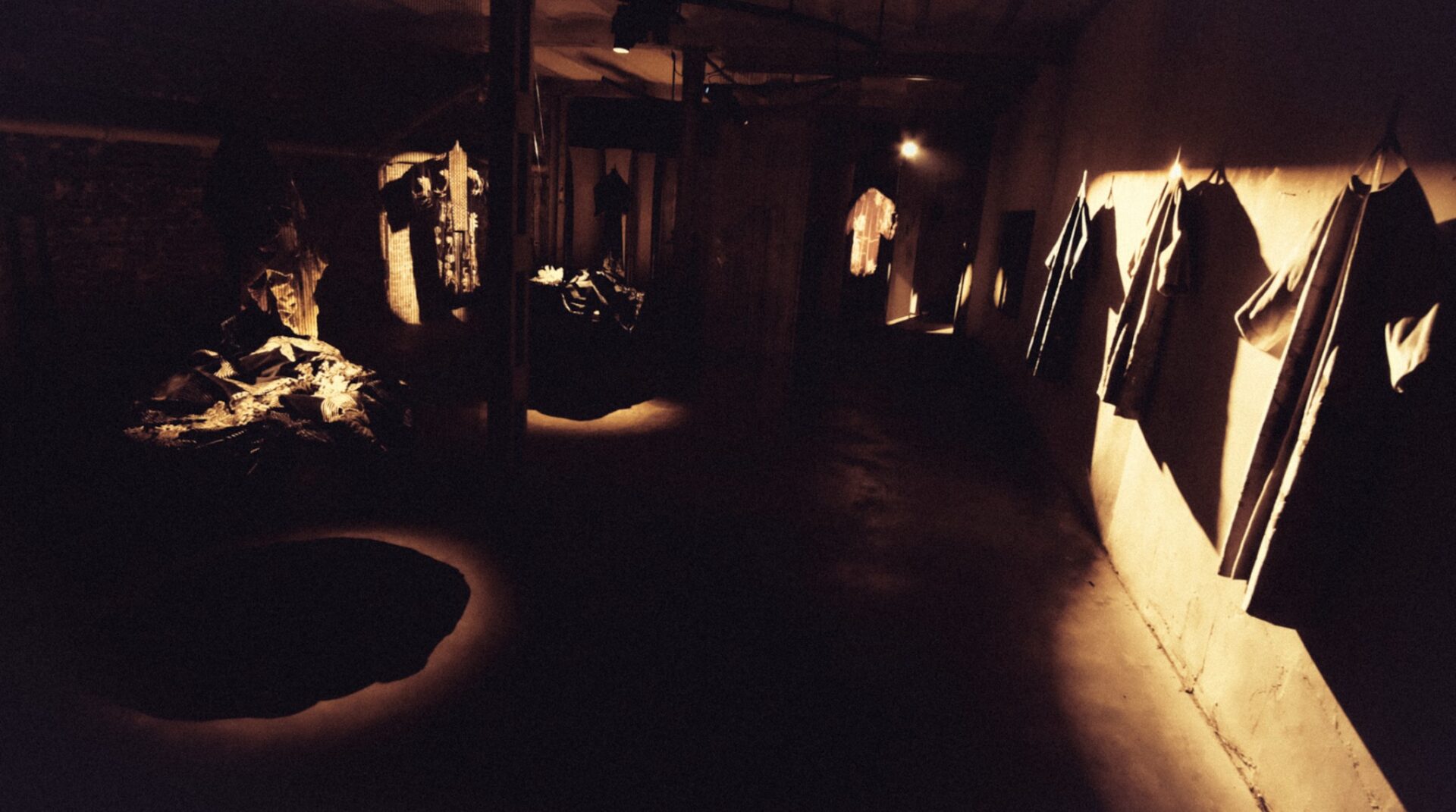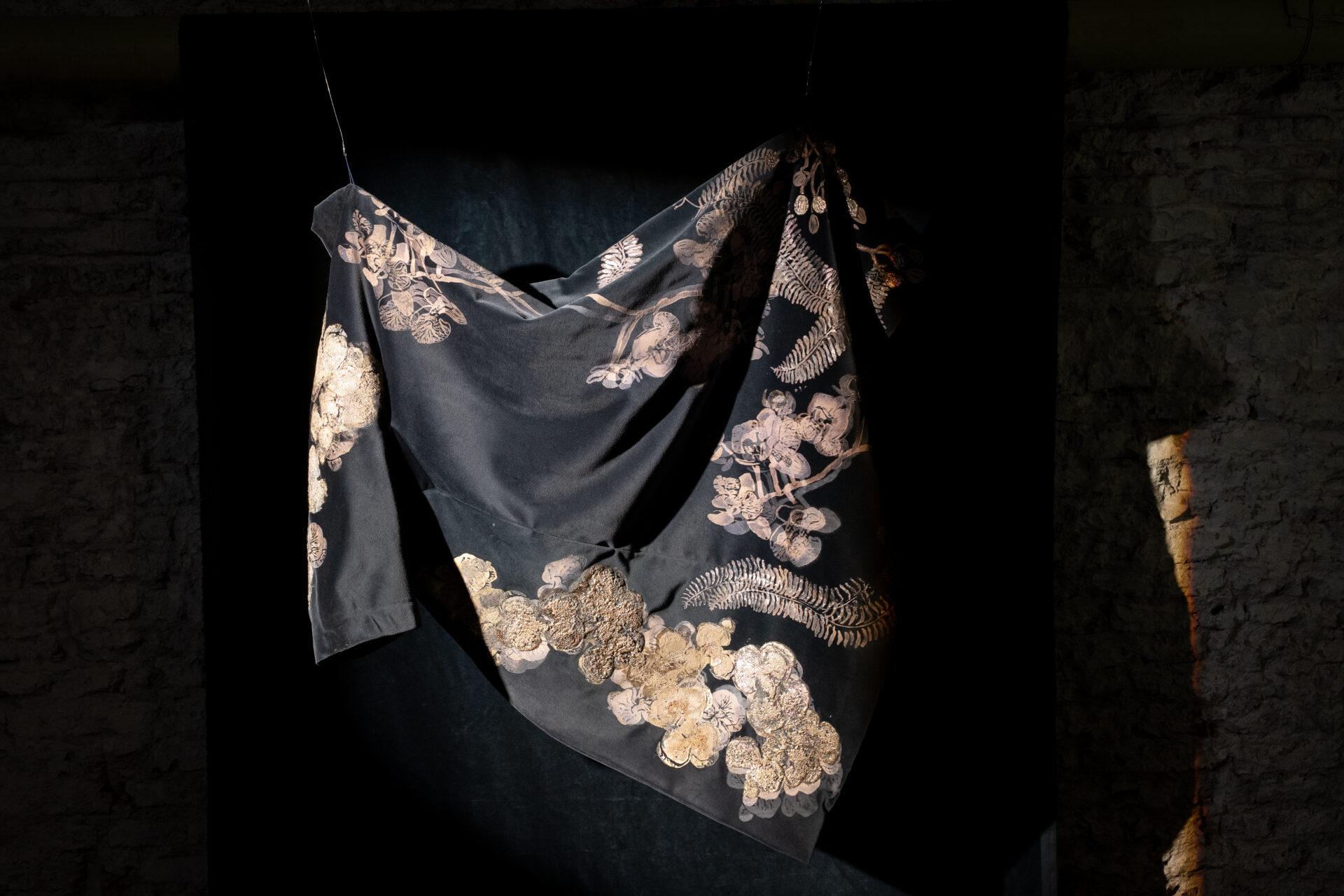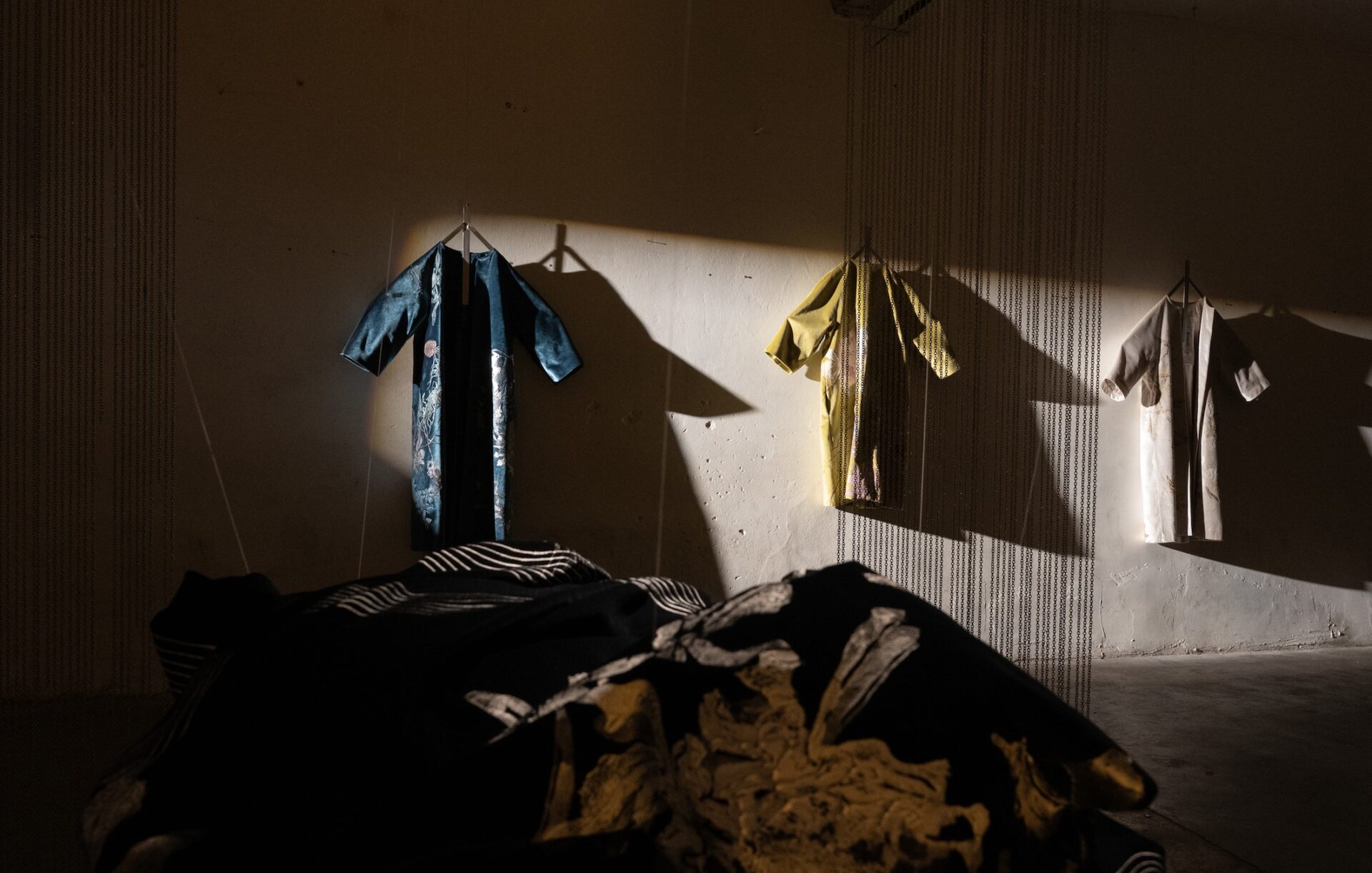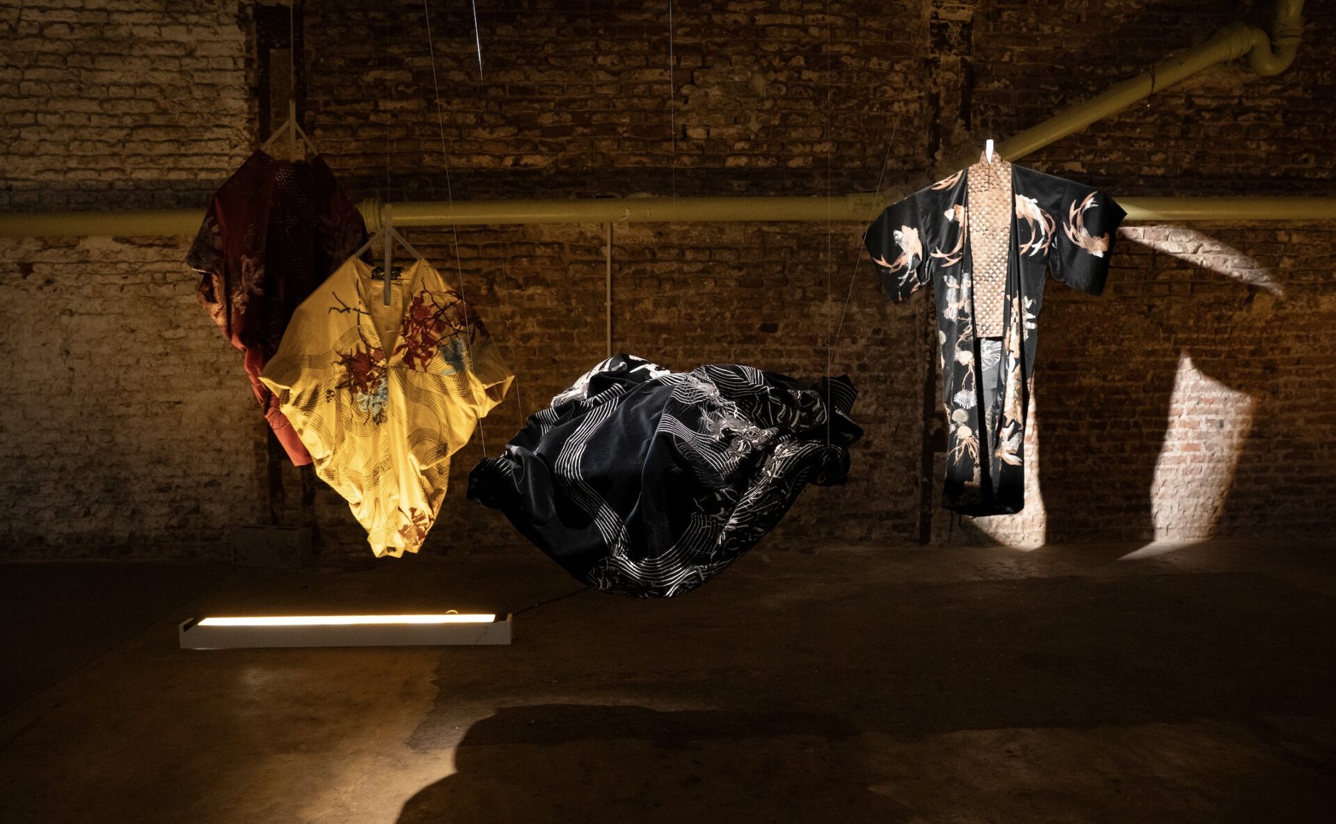 En este entorno, se revela un ecosistema de terciopelo, donde tapados, kimonos e islas flotantes entre luces y sombras. Los haces de luz atraviesan el espacio, creando formas efímeras, mientras cortinas de finas cadenas plateadas interrumpen ocasionalmente la quietud de este hábitat.