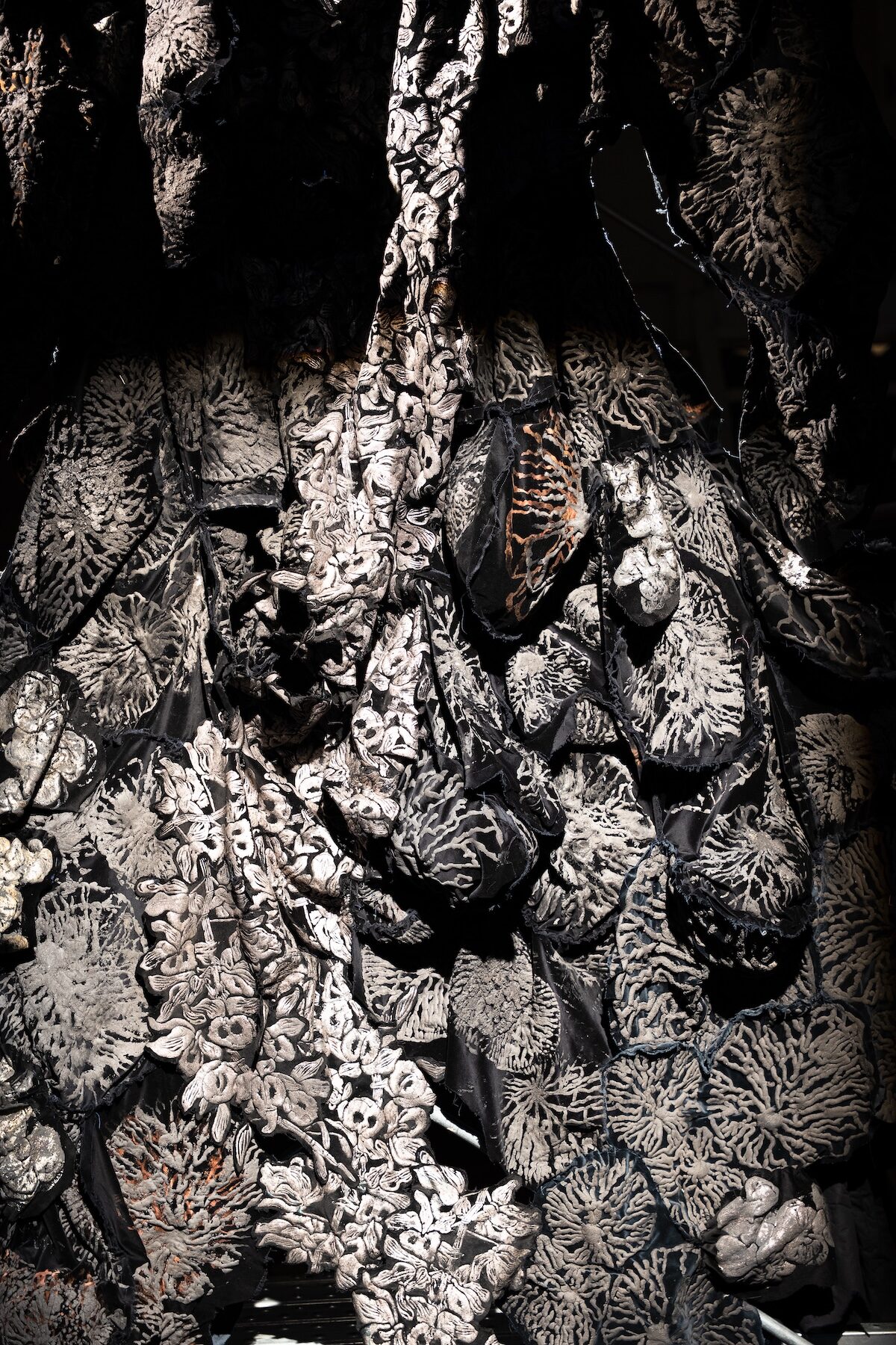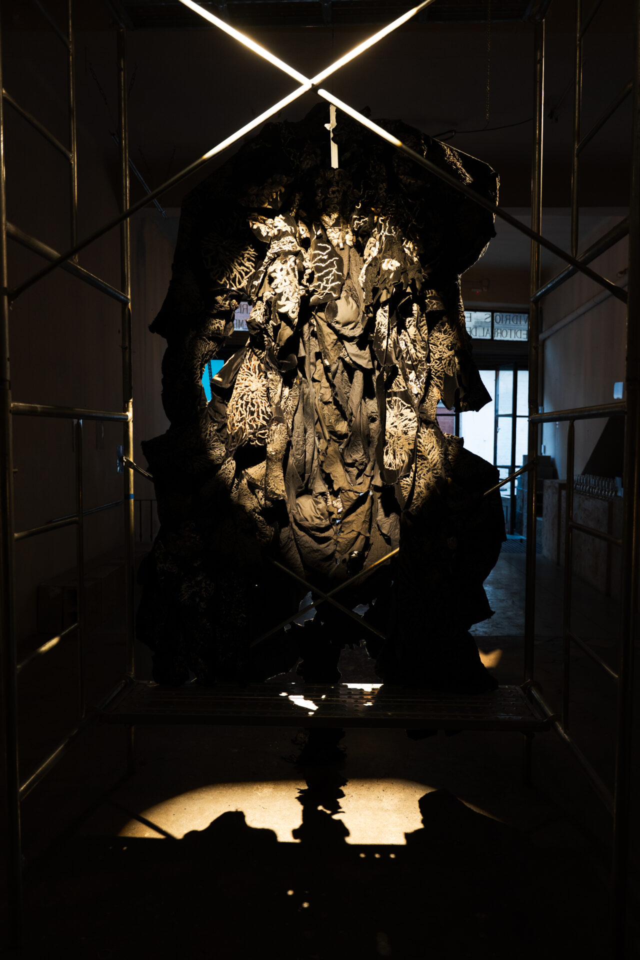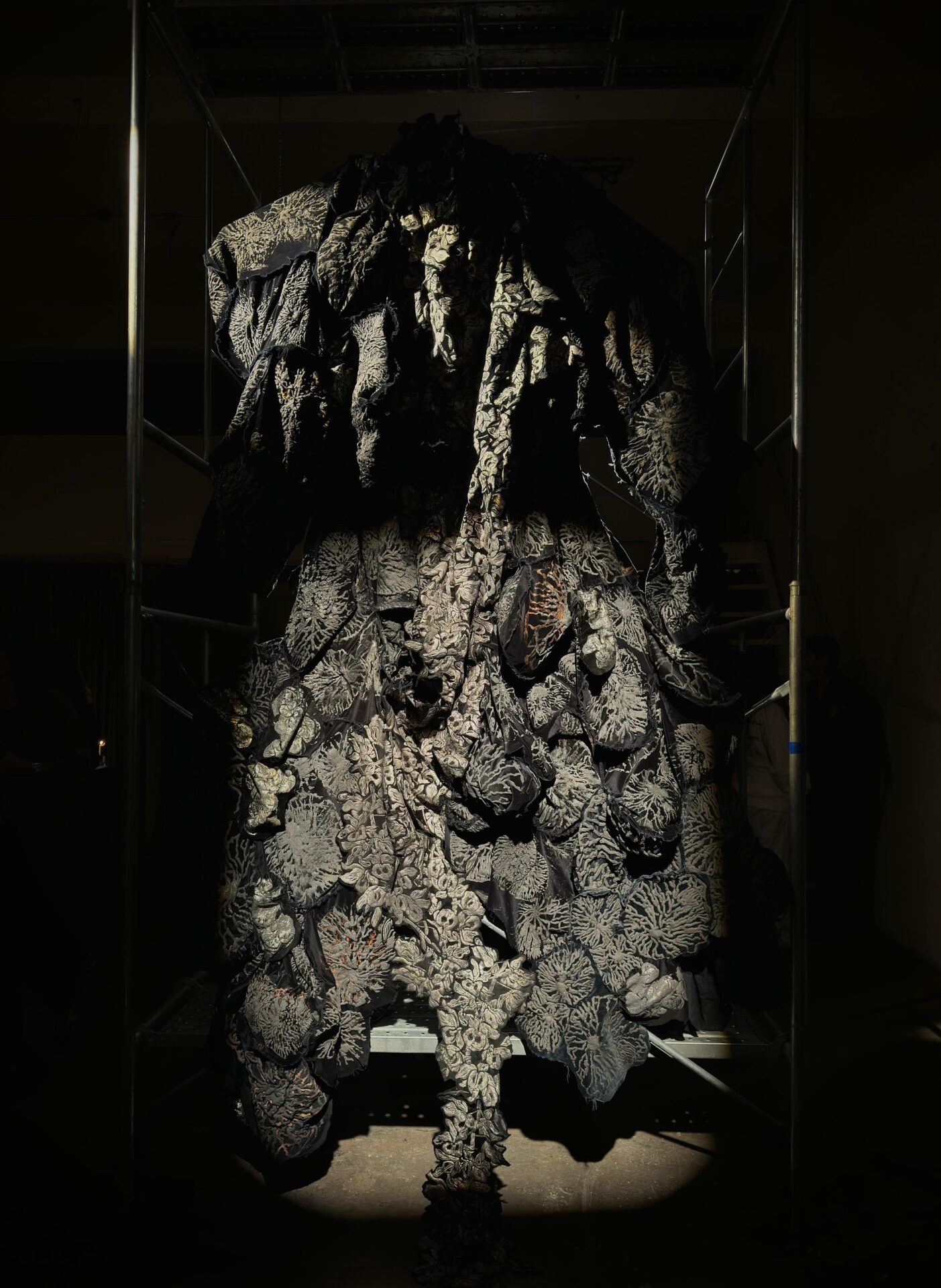 Una criatura de terciopelo negro y plateado. Un cuerpo desbordado, hecho de retazos de obras pasadas —como cicatrices—, contenido en una torre de andamios industriales.