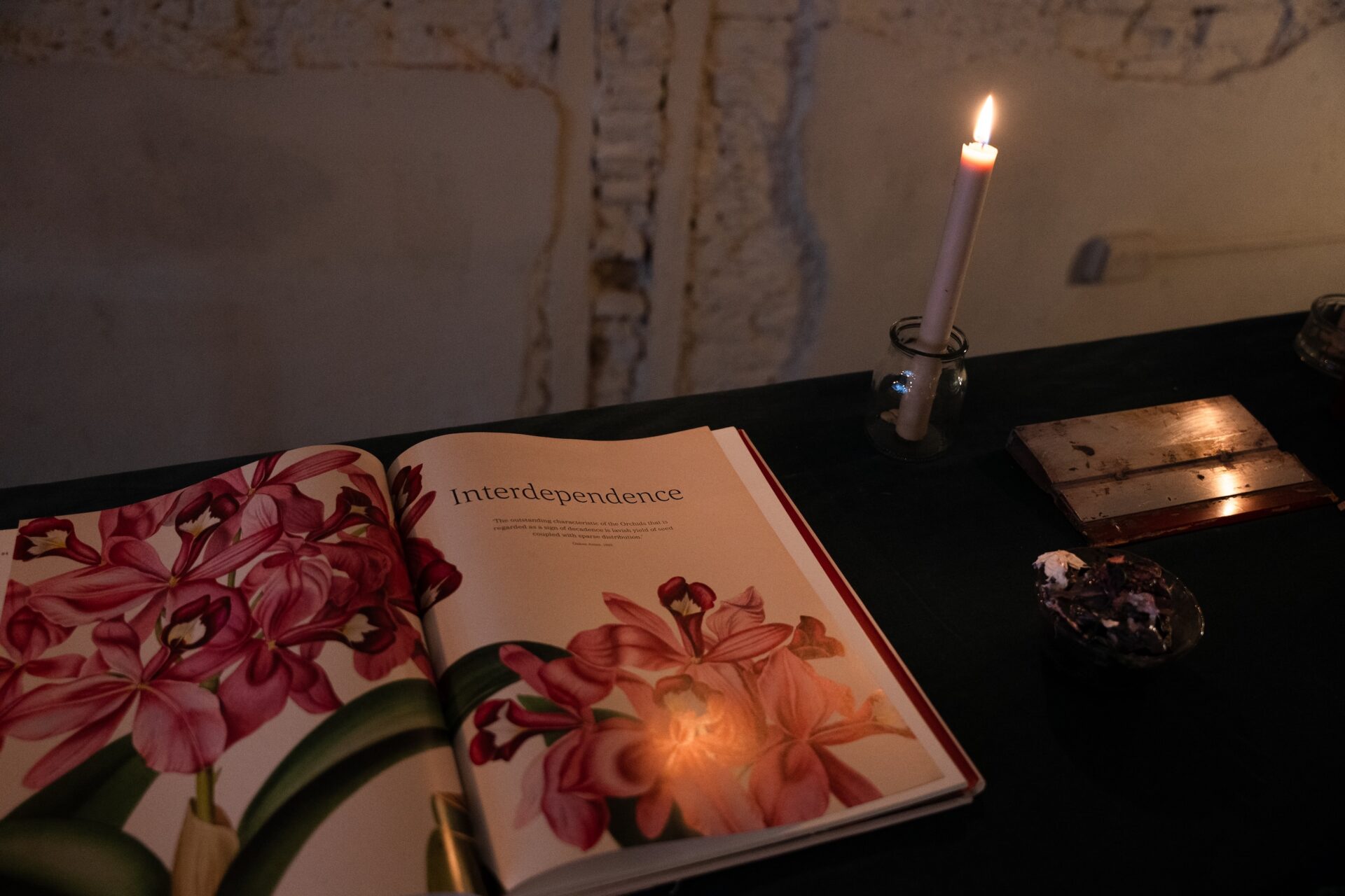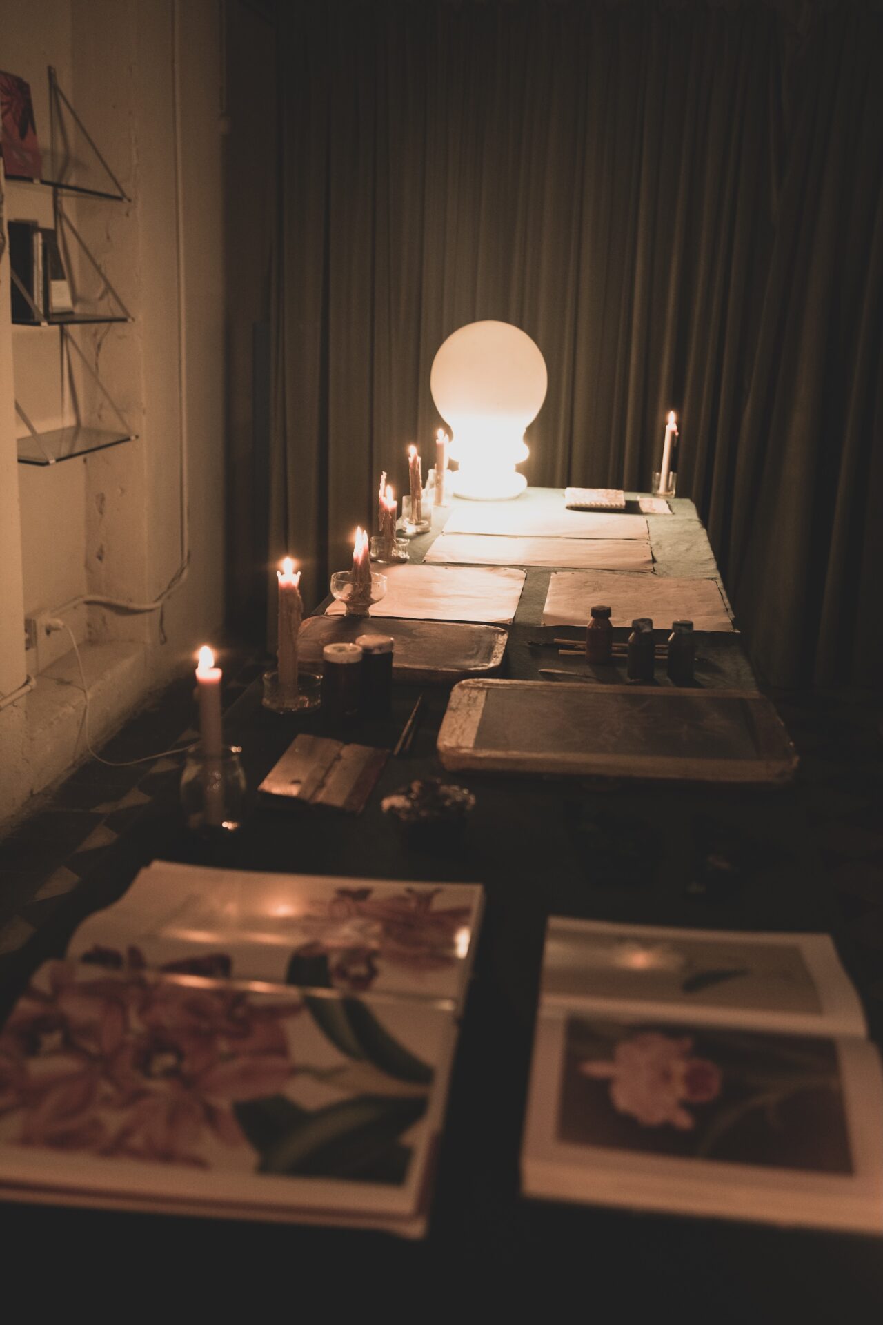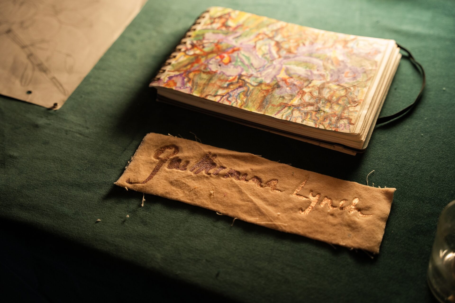 A la luz tenue, una mesa rebalsada de pistas nos invita a espiar —como voyeurs— los gestos que anteceden a la obra. Los libros que la artista usa para sus investigaciones creativas se encuentran abiertos, insinuando ser examinados. Luego, siguiendo el orden de su práctica, aparecen cuadernos, hojas con flores dibujadas a lápiz que aún conservan la presión de la mano, frascos de pintura, palillos, cucharas, pruebas de tintes sobre retazos de tela, shablones que evidencian el rastro, y por último, una etiqueta serigrafiada con su firma.