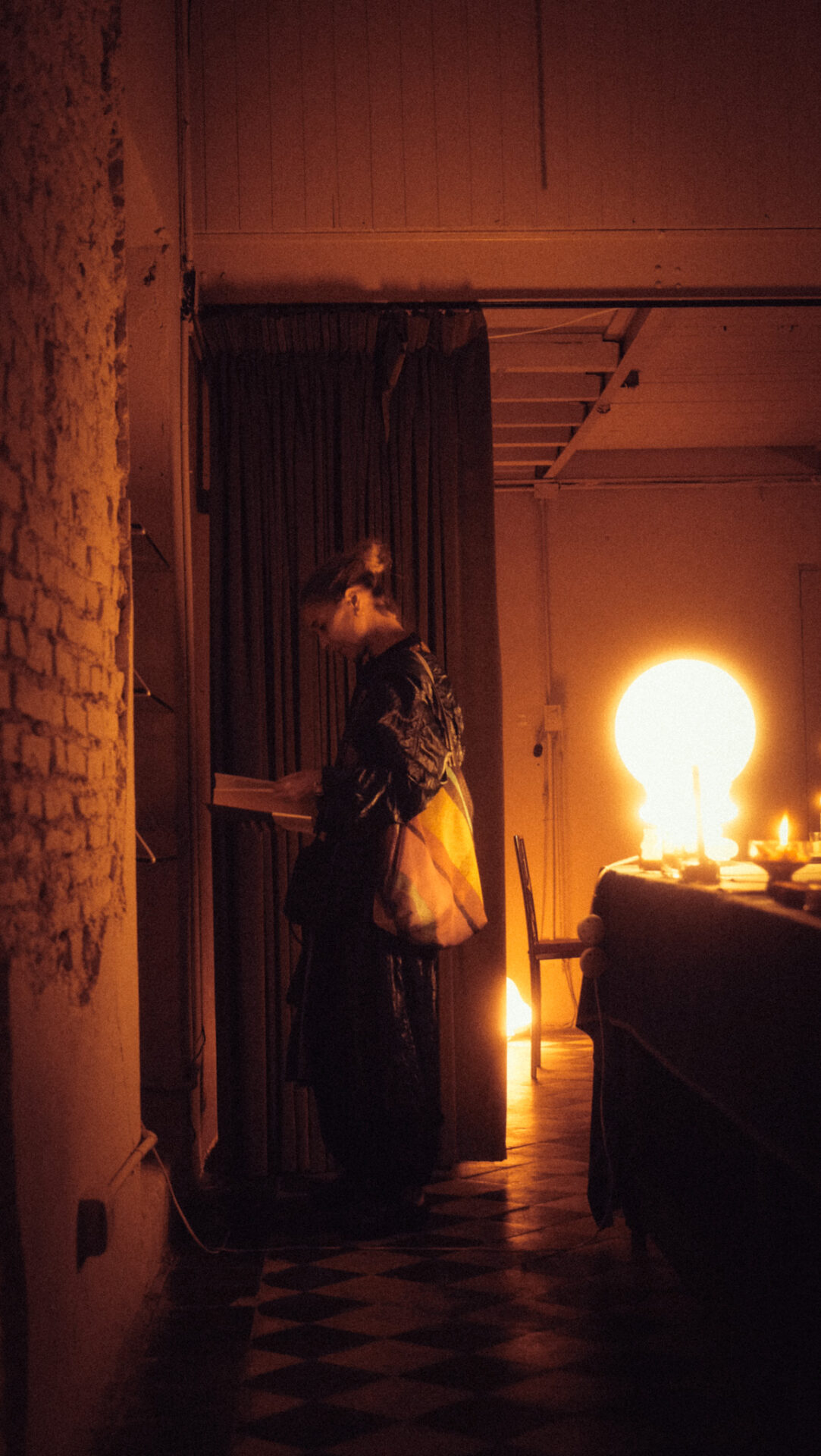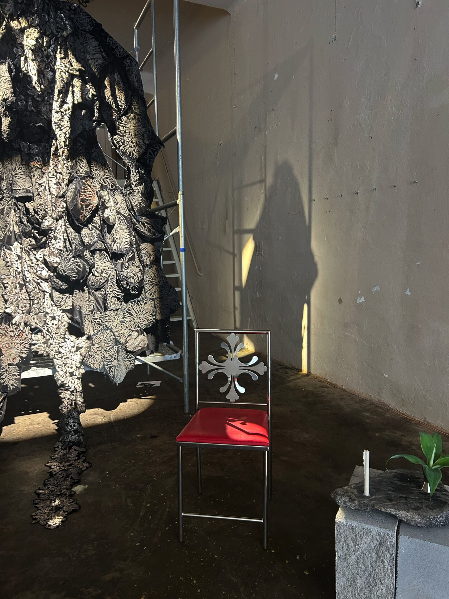 A medida que el cuerpo desciende hacia el subsuelo, se aproximan los cantos etéreos de Hildegarda Von Bingen, fusionados con experimentaciones sonoras que evocan el mundo vegetal. El sonido, que parece brotar de las propias paredes, invita a caminar en silencio, como si el eco de la naturaleza misma tomara el control del espacio, como si se tratara de una procesión tácita.