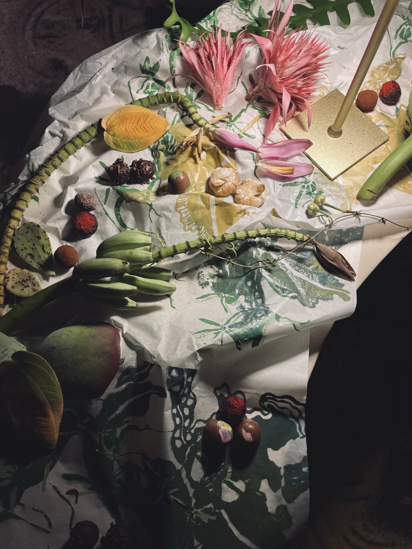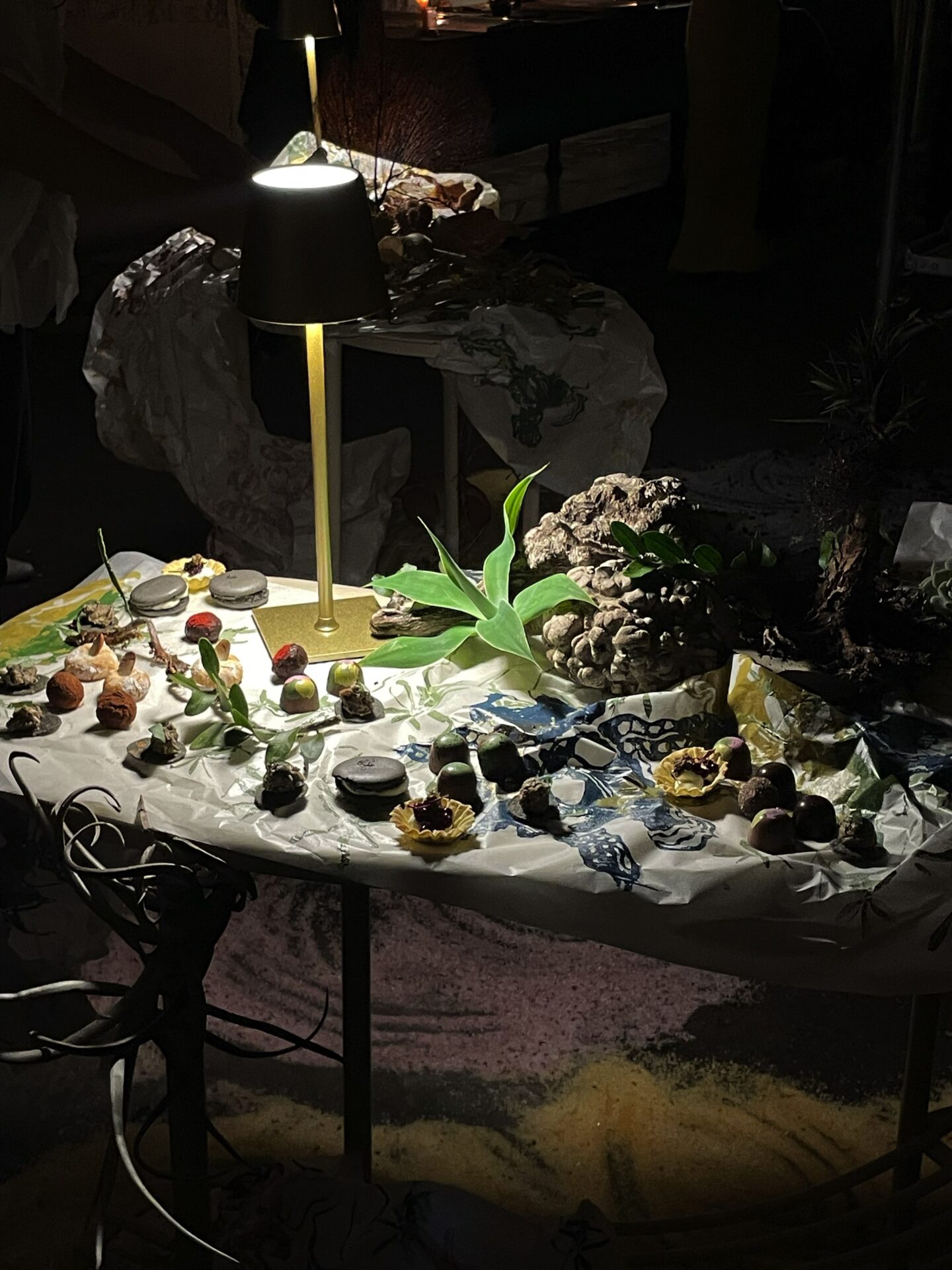 El piso estaba cubierto con sal rosada del Himalaya, que crujía bajo los pies mientras los participantes recorrían las mesas organizadas como jardines. Entre papel de seda, piedras y flores, se presentaban platos que jugaban con las apariencias: un macarrón que parecía dulce y floral contenía roquefort, y una crema suave sorprendía con un sabor picante. La propuesta invitaba a desplazarse con calma, en silencio, y descubrir detalles a través del tacto, la vista y el gusto, simulando el movimiento de los polinizadores.