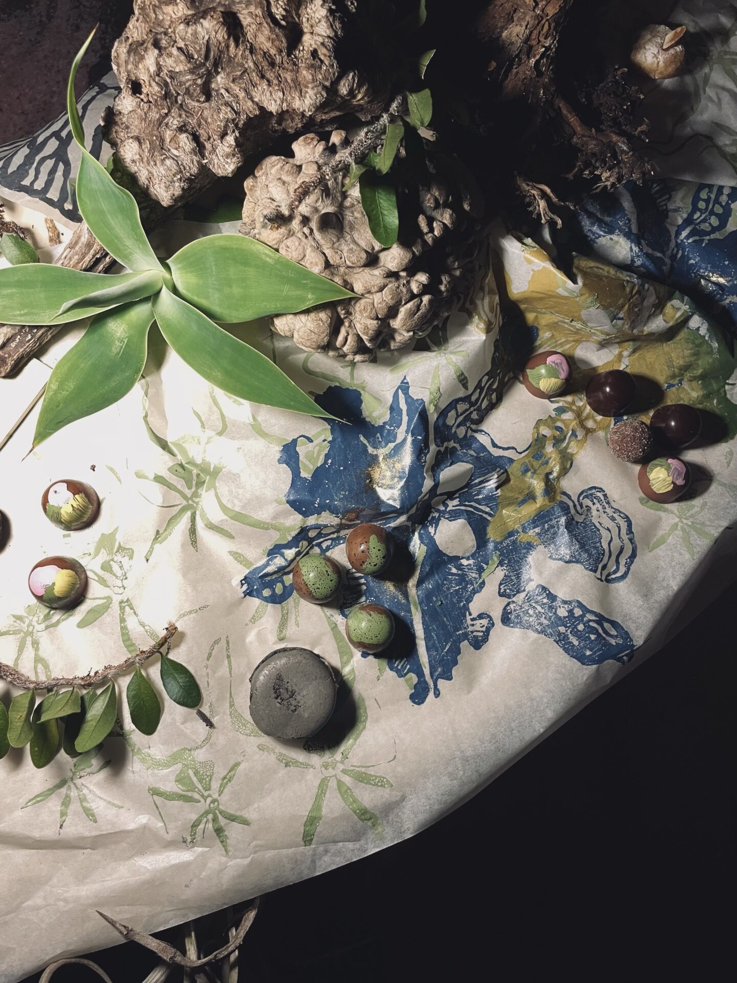 Todo puede recorrerse con la mirada, incluso con las manos. El mantel de terciopelo —textil emblema de su obra— funciona como base y escenario de este laboratorio matérico y táctil, donde lo botánico se encuentra con lo alquímico, donde cada objeto cuenta una historia de ensayo y profanación, de obsesión y azar.