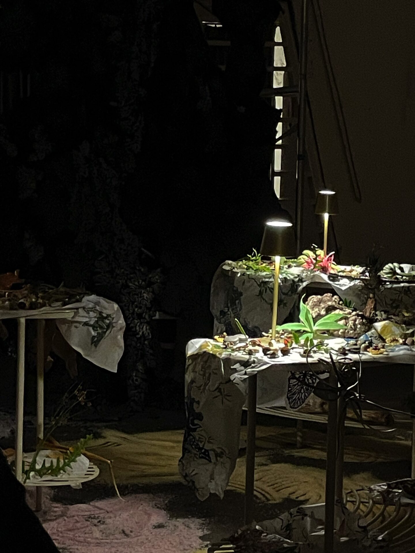 La muestra está estructurada en distintos momentos que se suceden como estaciones de un recorrido íntimo y transformador: una criatura monumental que recibe al visitante, un subsuelo habitado por islas, hongos y tapados de terciopelo, entre sonidos vegetales y cantos místicos, y un altar final de procesos donde la intimidad del taller se vuelve visible.